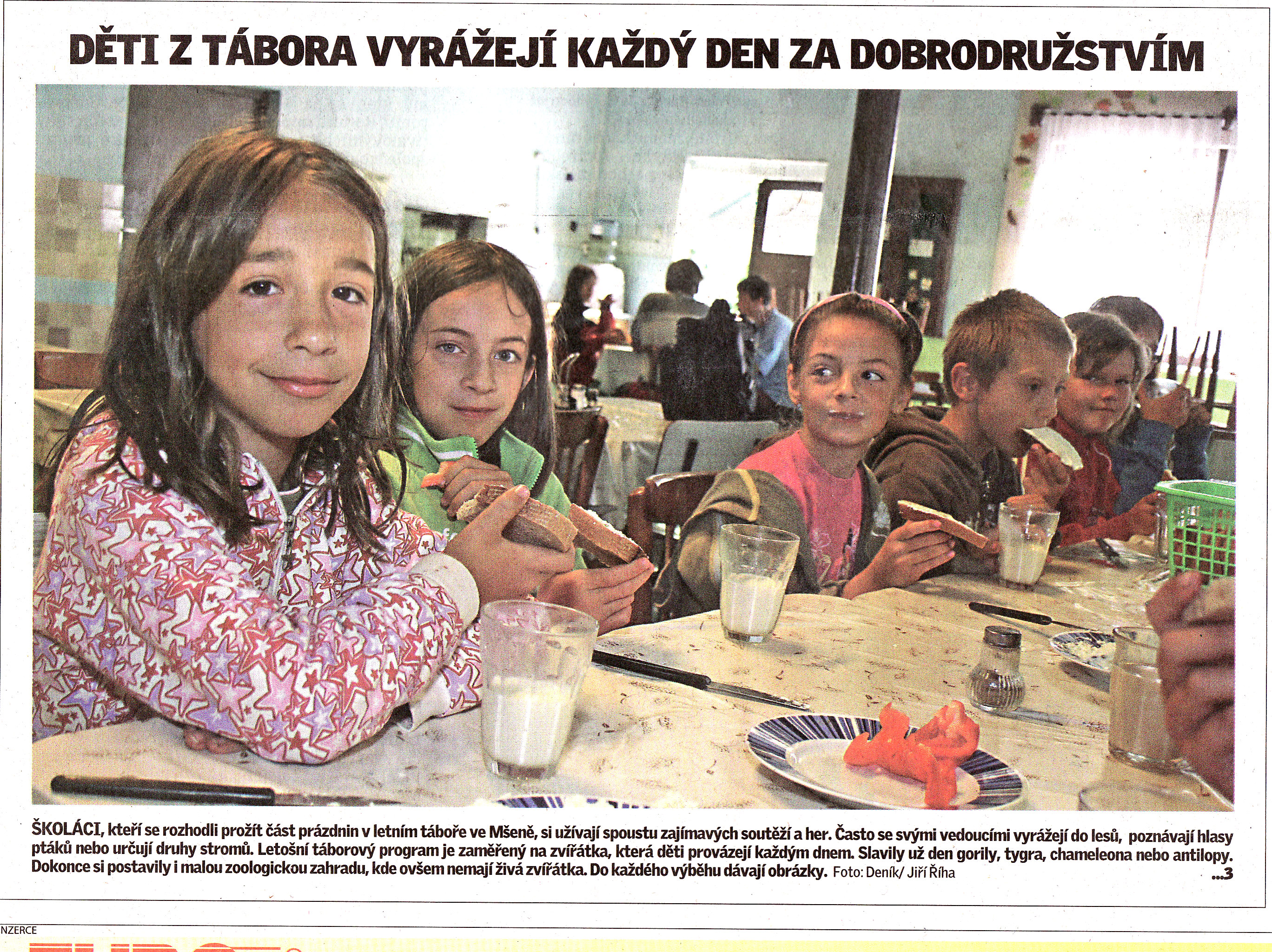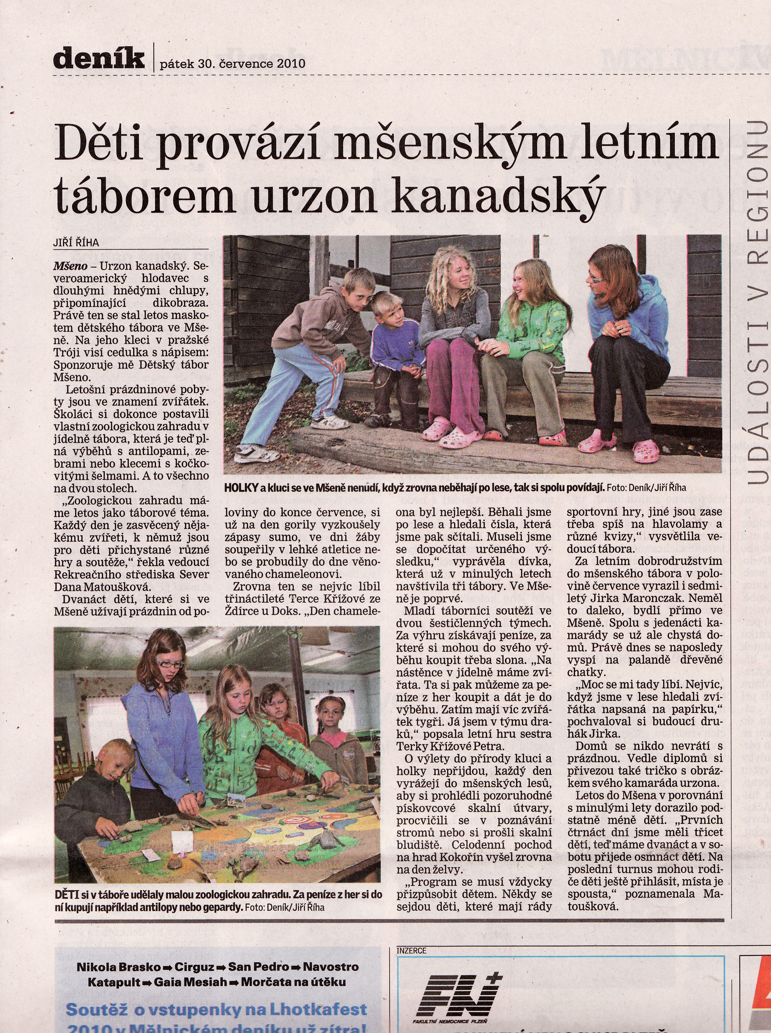 Redaktora Mělnického deníku zaujal ze všech táborů na Kokořínsku právě ten náš. Článek o něm vyšel v pátek 30. července 2010. Článek si můžete přečíst i v Mělnickém deníku na internetu . Jsou tam i další fotografie, které redaktor Jiří Říha v táboře nafotil. (kliknutím na noviny zvětšíte)